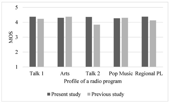 According to obtained results, all scores favor the digital system. The observed difference ranges from 0.02 (Arts—broadcasted in DAB+ at 128 kbps) and 0.05 (Pop Music—broadcasted in DAB+ at 128 kbps) to 0.77 (Regional PL—broadcasted in DAB+ at 112 kbps). Moreover, a comparison has been performed by considering the results published in 2017 [25], including the same group of radio programs as well as the same number of individuals, namely 45, participating in the listening study. The results are shown in Figure 2.