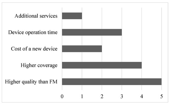 Not surprisingly, higher quality compared to FM radio was ranked as the most essential factor, followed by higher network coverage. Both device operation time and cost of a new device were viewed as less important. Surprisingly, additional services came last. This clearly shows that the biggest differentiator is audio quality itself. These few questions can be valuable guidelines for the upcoming years.
