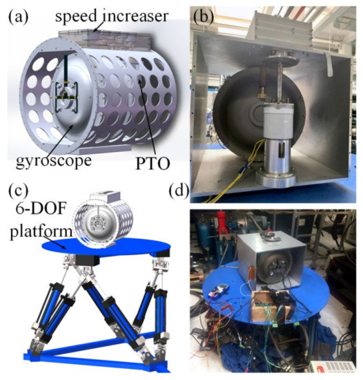 Prototype system and experimental setups: (a) CAD of assembly gyroscope; (b) GWEC physical prototype; (c) CAD of assembly experimental setups; (d) experimental environment.