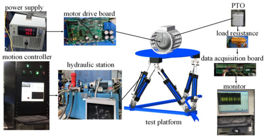 The workflow of the dry test is shown in Figure 4. The drive board is powered by the power supply to rotate the flywheel. At the same time, the hydraulic station controls the 6-DOF platform to simulate regular wave motion under the instructions of the motion controller. The angular velocity of precession generated by GWEC is transmitted to PTO through the speed increaser to generate electric energy. Finally, the monitor displays the voltage across the load resistance obtained by the data acquisition board. The supporting parameters of the dry test platform are shown in Table 3.