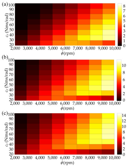 A wave period of 7 s was selected as the rated period in this paper, according to the RAO curve in Figure 2. This section analyzes the influence of different parameters on the output power of GWEC with the aim of increasing the energy conversion capability of GWEC as much as possible. Figure 5 shows a series of hot colormap arrays, which are all about the extracted average power of rotational speed and damping coefficient. The damping coefficient varies from 20 to 100 Nms/rad, and the flywheel rotational speed varies from 2000 to 10,000 rpm. The three sub-pictures are obtained under different wave amplitudes (A = 8°, 10°, and 12°).
