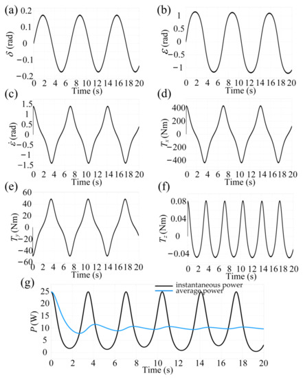 Performance of main parameters under rated conditions: (a) pitch amplitude; (b) flywheel precession angular displacement; (c) flywheel precession angular velocity; (d) torque in x direction; (e) torque in y direction; (f) torque in z direction; (g) output power (blue line is the average power, black line is the instantaneous power).