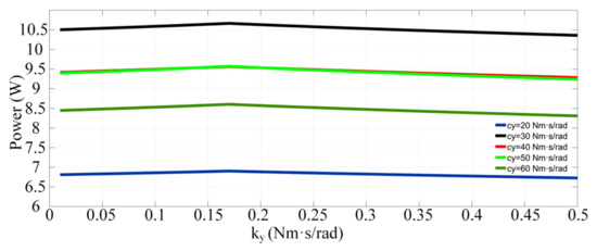Figure 7 shows the effect of stiffness on the output power for different damping coefficients. The stiffness coefficient behaves the same for the different damping coefficients chosen, and the output power peaks at ky = 0.17 for all of them. However, the further the stiffness is away from the optimum, the lower the output of the system is. Additionally, when the damping coefficient is near the optimal value, ky has a greater effect on the output power, while when cy is far from the optimum, ky has an insignificant effect on the output. It is also worth noting that if the PTO had no stiffness, the system would stabilize at a 90-degree angle of precession, and the gyroscopic effect would disappear and no precession torque or power would be generated.
