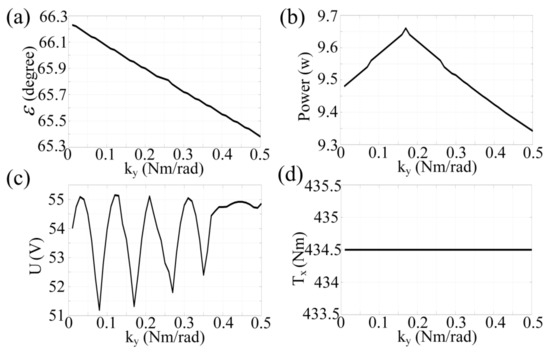 Figure 8 shows the effect of the stiffness coefficient on the main parameters of the system at rated condition. The precession angular displacement decreases as the stiffness coefficient increases, but the output power still reaches its maximum at ky = 0.17. The peak voltage fluctuates with a sinusoidal cycle at the beginning of the simulation and stabilizes gradually with time. The torque in the x direction is completely independent of ky.