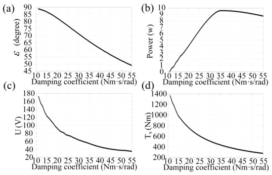 Figure 9 shows the effect of the damping coefficient. It can be found from the expression of Equation (7) and combined with Figure 7 that the damping coefficient cy is crucial for the output power. The maximum angular displacement of precession will decrease as the damping coefficient increases. From the perspective of output power, when the damping coefficient is less than the rated value, the system output will drop sharply, while the maximum voltage and x-axis torque increase significantly, which is not conducive to the stability of the system. When the damping coefficient is greater than the rated value, the output power, peak voltage and torque on the x axis will all decrease slowly.