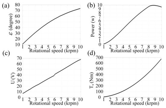 Figure 10 shows the importance of flywheel rotational speed. The angular displacement of precession will increase as the flywheel rotational speed increases. A smaller rotational speed will cause a sudden drop in power, and a larger flywheel speed will cause a slow drop in output due to the need to overcome air resistance and maintain flywheel rotation. Additionally, the output voltage is almost linear with the flywheel rotational speed. The torque on the x-axis, on the other hand, increases rapidly with flywheel rotational speed, which will make the entire system behave as a space stabilizer, and higher rotational speed means greater air resistance and maintenance power, and is not suitable for power output.