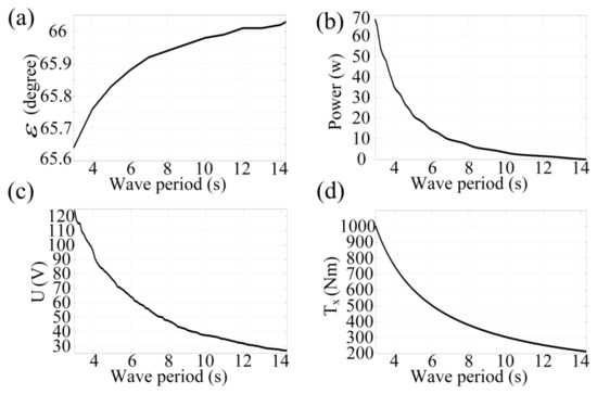Figure 11 shows the influence of the wave period on the system when the GWEC obtains the complete response to the wave amplitude. The increase in the wave period can only increase the maximum precession angular displacement slightly. Although a small wave period can obtain an ideal power output, it will produce a huge peak voltage and torque for the system, which will cause a shock to the system and significantly increase the hardware requirements and experimental costs of the platform. Therefore, too small a wave period is not suitable for wave energy generation, even if the system can fully respond to waves. A larger wave period reduces the system demand but also reduces the output power, so there is a trade-off between wave period and system output to determine a suitable system frequency according to the ocean conditions.