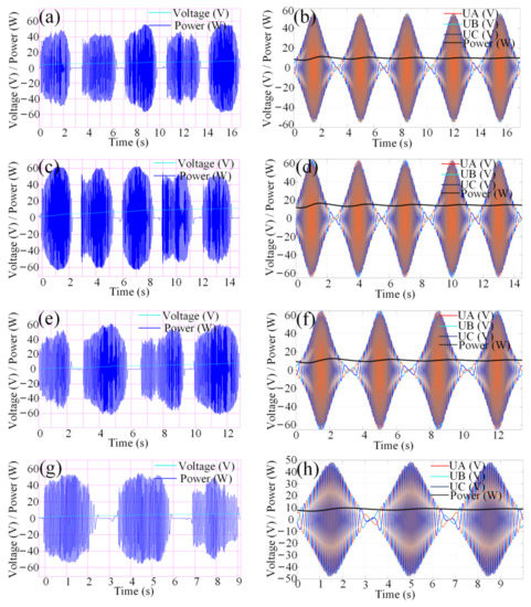 Comparison of experiments and simulations under different conditions: (a) test voltage and power under rated conditions; (b) simulated voltage and power under rated conditions; (c) test value under T = 6 s; (d) simulated value under T = 6 s; (e) test value under A = 12°; (f) simulated value under A = 12°; (g) test value under = 7000 rpm; (h) simulated value under = 7000 rpm.