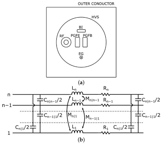 SPIDER transmission line considered in the circuital model. (a) SPIDER TL cross-section (not in scale). (b) Equivalent pi-representation of the multiconductor TL.