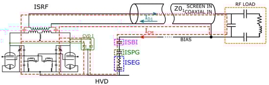 CVD inner leg: the CVD leg connected to the inner conductor of the RF coaxial line (CVD inner leg) allows the circulation of a differential mode current between one of conductors in the transmission line and the outer screen of the RF coaxial line. One of these possible connections is represented in Figure 4b, where the bias conductor and the outer part of the RF coaxial line screen assume the role of a transmission line with characteristic impedance , supporting the circulation of a differential current . In this case, the stray currents magnitude depends on the differential voltage at the secondary side of the RF transformer.