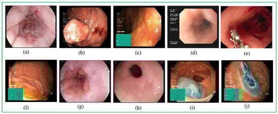Raw input multi-class gastrointestinal endoscopy images. Respectively, (a–d) refers to pathological findings; (e) refers to artefacts and equipment; (f–h) refers to anatomical landmarks; and (i,j) refers to polyp removal images. (a) Esophagitis, which refers to an inflammation of the esophagus, visible as a break in the esophageal mucosa with the Z-line; (b) polyps are lesions within the bowel detectable as mucosal outgrows; (c) ulcerative colitis refers to a chronic inflammatory disease affecting the large bowel; (d) early esophagus cancer; (e) images with artefacts and diagnostic equipment; (f) the cecum (the most proximal part of the large bowel); (g) The Z-line that marks the transition site between the esophagus and the stomach; (h) the pylorus (the area around the opening from the stomach into the first part of the small bowel, called the duodenum); (i) dyed-lifted-polyps; (j) dyed-resection-margins.