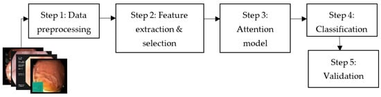 This subsection describes the DL-based method for using the attention mechanism in the GI disease classification of multi-class and multi-sited endoscopic images. In step 1, unnecessary background features, text, and other artifacts were removed from each sample dataset during pre-processing. Images were resized to 224 × 224 pixels for the experiments. As shown in Figure 1, the raw images that contained unnecessary background and text were removed during pre-processing, and the class balancing technique was applied with ECA-DDCNN [15]. Eighty percent of the data were used for training and 20% for testing. To avoid overfitting and imbalance, data augmentation techniques were used, such as transposing, flipping, rotating, random brightness, blurring, distortion, contrasting, and limited adaptive histogram equalization. After data augmentation, the total training data were comprised of forty thousand images. In step 2, the pre-processed data were utilized for the whole model’s experiments. In step 3, disease detection and classification were implemented with attention mechanisms. In step 4, disease classification or lesion categorization of the proposed method was validated using 20% of the test data. Finally, in step 5, the output was evaluated quantitatively and qualitatively using appropriate evaluation metrics and visualization techniques as shown in Figure 2.