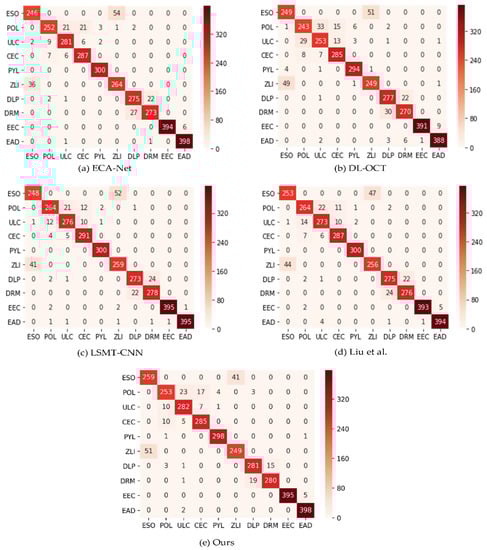 Confusion matrix of the GI disease classification on test datasets. The confusion matrix indicates the actual and predicted results of all ten classes: (a) The GI disease or artifacts classification performance of the ECA–Net [23], which classified pylorus better (100%), with the lowest classification (82%) achieved in esophagitis. (b) Classification accuracy of the DL–OCT [10] method’s performance. The method classified pylorus better (98%) and challenged the classification of polyps (81%). (c) Confirmed the competitive classification performance of the LSMT–CNN [29] method. The method better identified pylorus (100%) and showed the lowest classification results (82%) in the esophagitis class. (d) Liu et al. [5] demonstrated better classification in pylorus. (e) The proposed method, like other methods [23,29], classified pylorus better (100%), and the approach showed the lowest performance (84%) in the esophagitis disease classification.