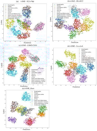 Validation of GI disease classification using the t-distributed stochastic neighbor embedding (t–SNE) visualization technique, which shows the transformation of high-dimensional features into low dimensions by preserving key features. The t–SNE technique provides better identification of each class in terms of depth-wise and color-wise approaches: (a) The ECA–Net [23] t–SNE method of classification performance and differentiates each class using multiple colors. (b) The DL–OCT [10] method’s t–SNE-based classification of each GI lesion category. (c) The LSMT–CNN [29] method’s t–SNE based classification results. (d) Liu et al. [5] t–SNE projection results. (e) The proposed method’s t–SNE-based classification performance, which outperforms other related works significantly.