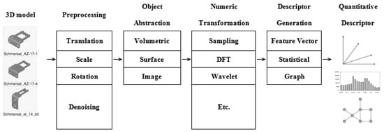 - Rotation: since each model may not have the same angle when placed (e.g., upright, flat, etc.), several difficulties in comparisons can arise (e.g., reversed, tilted, etc.). To this end, 3D models must be appropriately adjusted. In the literature, some methods, such as PCA and CPCA, have been applied to solve such problems [21].