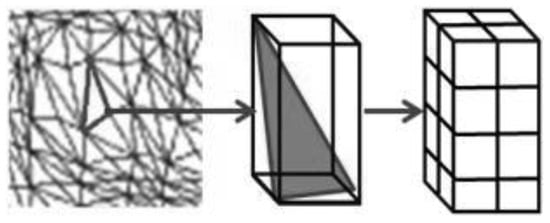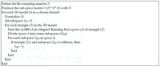 - Step three: re-sampling. Our method applied a collision detection method to perform re-sampling, which entailed testing each subspace Sijk as a collision with a 3D model (where i, j, and k mean the x, y, and z axes respectively). If it was a collision, then the subspace was labeled as 1; if not, 0. Consequently, we could obtain a sampling matrix, which was composed of 0s and 1s. However, this sampling matrix acted a basis for our classification features. The labeling method is by: