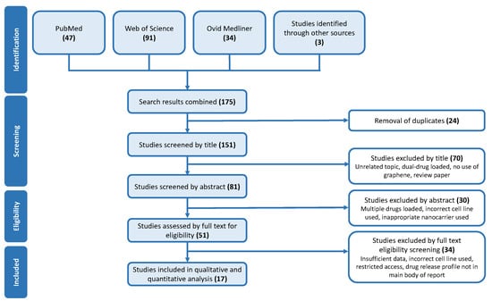A systematic search of three library databases enabled the accumulation of previous publications that have incorporated DOX-loaded graphene nanocarriers for research into the response of breast and ovarian cancer cell lines. As illustrated by the search and inclusion flowchart (Figure 3) from the initial search, the study identified a total of 175 studies, 47 from PubMed®, 91 from Web of ScienceTM, and 34 from Ovid Medline®; a further three were identified through referencing. Through combining the search engine’s results, twenty-four publications were immediately excluded through duplication. Seventy records were then removed simply because their title did not adhere to the inclusion criteria; for example, those that were based on GQD nanohybrids, those that loaded more than one chemotherapeutic in addition to DOX, or those of an unrelated topic. A further thirty studies were removed through screening of the abstract, and thirty-four were removed through screening the full text. Commonly the excluded papers used an inappropriate cell line, incorporated multiple drugs, or provided insufficient drug release data.