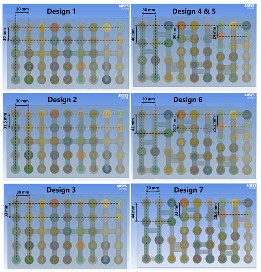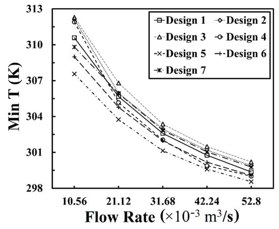 Since Tmin is not the direct evaluation criterion, it is not as important as other indicators such as Tmax and ΔT. The Tmin of seven designs at five flow rates are shown in Figure 7. Design 5 consistently showed the lowest Tmin (307.55 K, 303.74 K, 301.14 K, 299.60 K, and 298.55 K) at all five flow rates, towering above the other designs in terms of the temperature reduction capacity. The deduction of Tmax and Tmin, i.e., ΔT, is a direct evaluation criterion which should be lower than 5 K. Therefore, higher Tmin is better since lower Tmin could result in higher ΔT adversely, triggering the violation of the evaluation criterion of ΔT (≤5 K). Design 2 and Design 3 were both proven to deliver higher Tmin values at five flow rates, showing the temperature reduction incapacity of the CVSG designs with larger vertical spacings (31.5 mm and 33 mm). On the other hand, the GVSG designs with smaller spacings (40/30/24 mm and 42/31.5/25.2 mm) delivered lower Tmin values at five flow rates, which could also insinuate the poor temperature uniformity performances of Design 5 and 6.