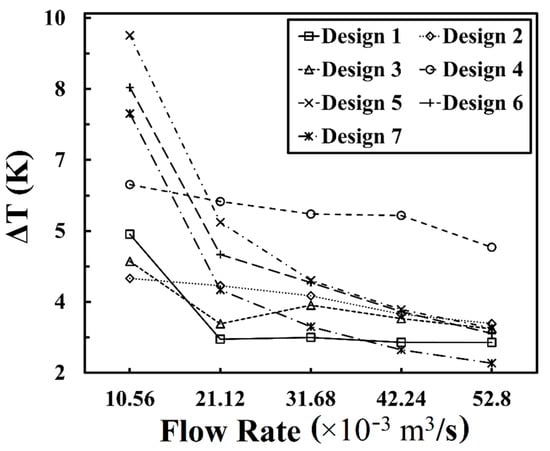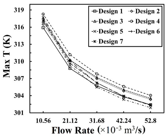 At 42.24 × 10−3 m3/s, Tmax of Design 5 (303.33 K) was 0.47 K lower than Design 1 (303.80 K), but the ΔT of Design 5 (3.74 K) was 0.7 K higher than Design 1 (3.04 K). Meanwhile, ΔT of Design 7 (2.88 K) was 0.16 K and 0.86 K lower than Design 1 (3.04 K) and Design 5 (3.74 K), respectively. However, Tmax of Design 7 (303.93 K) was 0.13 K and 0.6 K higher than Design 1 (303.8 K) and Design 5 (303.33 K). Therefore, the optimal design at 42.24 × 10−3 m3/s becomes a conditional evaluation depending on the aspect in priority: 1. Design 5 is optimal if lower Tmax is the major objective; 2. Design 7 is optimal if ΔT is mostly concerned; 3. Design 1 is optimal if a balanced thermal performance is required.