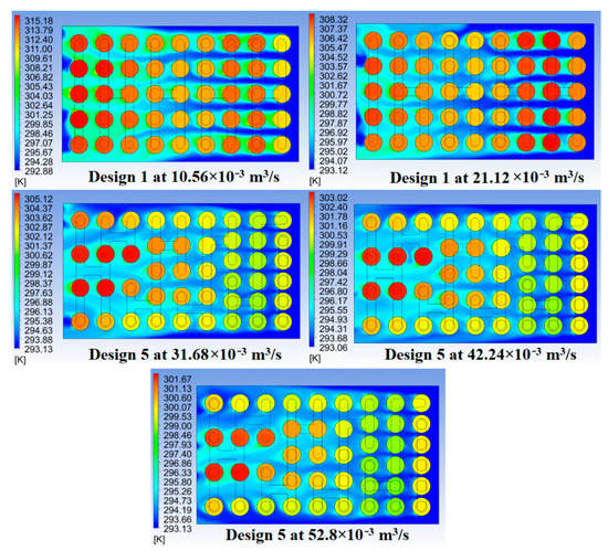 At 31.68 × 10−3 m3/s, Design 1 firstly met both evaluation criteria and continued to hold its top position for its first place in ΔT (3.14 K) and second in Tmax (305.74 K). Although Design 5 delivers the lowest Tmax (305.49 K), its ΔT (4.35 K) is 0.24 K higher than the average ΔT of all designs (4.11 K).