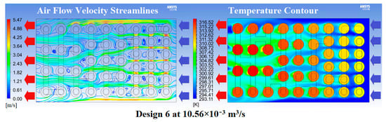 Air flow velocity streamlines and temperature contour of Design 6 at 10.56 × 10−3 m3/s.