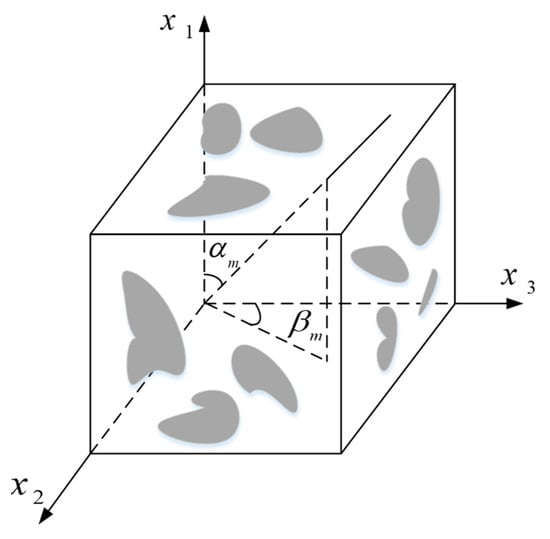 The distribution equation of void space is determined based on the principle of stereology. The equation is determined by the average porosity (scalar) and the symmetric fabric tensor that trace is 0 []. Tobita [] used the REV (Representative Element Volume) method to detect the void fabric distribution quantitatively. As shown in Figure 1, the first step is to select a sample space with enough particles to perform mathematical statistics. The second step is to determine a measurement sphere. Finally, the length L in the sphere is the scan line, and the length of the scan line truncated by the void is the measured void length. By rotating the scan line throughout the sphere, the void distribution in the sphere is measured. Therefore, the void distribution in spherical coordinates is ll(α,β) = ∑li(α,β), and the ratio of scan lines to void is as follows: