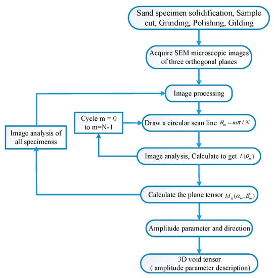 According to the theoretical determination method of void tensor presented in this paper, an image analysis program is compiled with Matlab, and the program frame diagram is presented in Figure 3, which shows the whole process of fabric determination. Since the major purpose of this study is to determine the orthotropy of the void tensor, cube specimens are required for specimen collection and preparation.