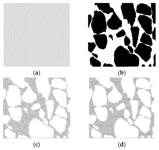In the image analysis, the scan line and the image processing diagram of specimens are operated with “&”, and the intersection image of the scan line and void is obtained, then void data is extracted. Figure 4 shows the calculation results of image analysis with parallel scan lines. Figure 4a is the diagram of the scan line (60°). Figure 4b is the binary image. Figure 4c is the result measured by the 60° scan line and Figure 4d is the result measured by the 30° scan line. The number of scan lines is 180.The scan line is drawn by AutoCAD. Figure 4c,d show that the calculated image will better describe the void distribution.