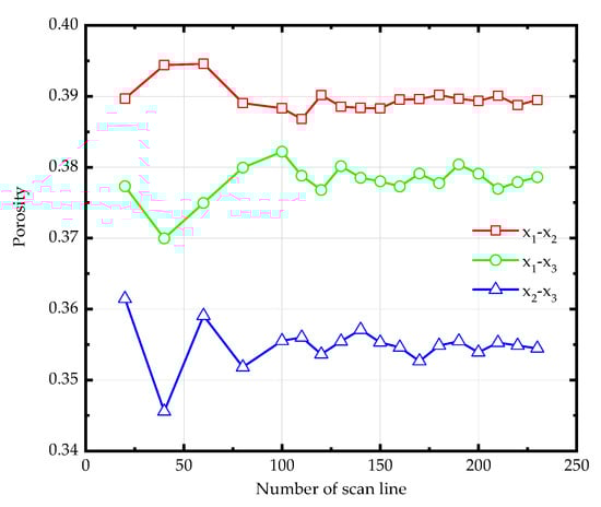 To sum up, the average porosity fluctuated greatly when the number of scan lines was small, but after reaching a certain number, the value tends to be constant. The average porosity is a scalar, which is independent of the direction. Thus, parallel scan lines can measure the average porosity, but cannot measure the distribution of voids.