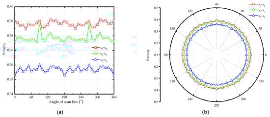As is presented in Figure 5, the fewer the number of test lines, the greater the impact on the porosity. However, as the number of scan lines increases, the fluctuation tends to be stable and nearly constant. When the number of scan lines is more than 100, the porosity fluctuation is ignored. Therefore 230 scan lines were used in this test. Figure 6 shows the relationship between the angle of parallel scan lines and porosity. The angle of the scan lines varied from 0° to 180° with an angle interval of 10°. Figure 6a shows that the porosity varies little with the angle of the scan line and is close to a constant value. Figure 6b intuitively shows that the plane porosity measured by parallel scan lines is an invariant, which cannot reflect the plane distribution of voids.