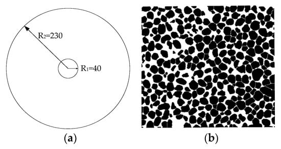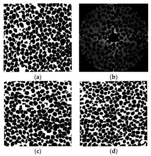 Experimental images are selected from reference []. Kuo et al. [] used SEM (Scanning Electron Microscope) to collect images of sand in three orthogonal planes from solidifying sand specimens. The image processing technology is used to obtain a clear picture of the void distribution, and then the image analysis technology is used to extract the void information. The distribution of voids is obtained by annular scan line, of which the number is 180. The inner diameter R1 is 40 pixels and the outer diameter R2 is 230 pixels. The calculation results are presented in Figure 8b.