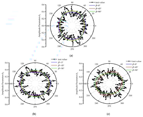 According to the results of the void fabric on the orthogonal plane in Figure 9, the test laws of different spatial scan lines for the same plane image are analyzed. Figure 10 shows all possible spatial distributions with the different βm in three planes. It is concluded from the figure that amplitude parameters on different planes have different effects on β. With the variation of the spatial position of the scan line, the trend of b1 and b2 is reversed, while b3 remains unchanged, which is consistent with the theoretical definition in this paper. Since the trace of the void fabric is defined as 1, any two amplitude parameters measured in Figure 10 can be used to describe the orthotropic of the void fabric. In Figure 10, when βm = 45°, then b1 = b2. The void distribution is used in Equation (22) to describe the transversely isotropy of the void fabric. In this case, the value of the void fabric is unique. Hence, the measured form of fabric tensor is also unique.