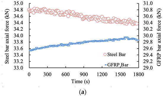 Figure 10c, shows that the axial force-time process of the steel and GFRP bar was stable at 1.75 m away from the zero point under a constant load of 150 kN, indicating that the bond state of the bar body at this point is stable and had no bond degradation [24].