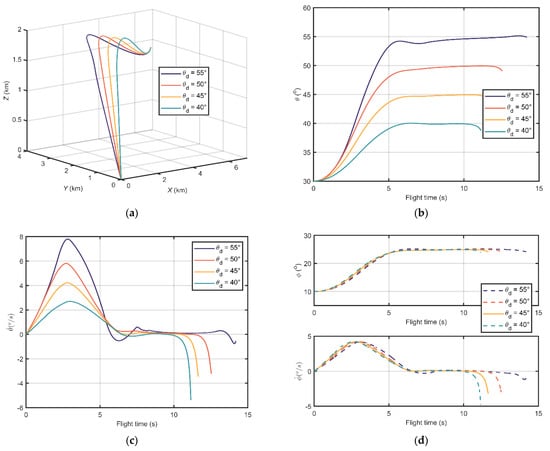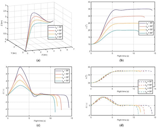 - Under the simulation condition given in Section 4.1, missiles using the proposed guidance law can achieve high guidance accuracy (ZEMs are smaller than 0.7 m) and high terminal angle accuracy (angle errors are smaller than 1°) in a short flight time;