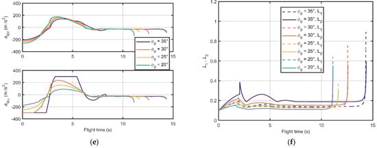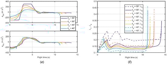The simulation results under various desired terminal elevation angles: (a) Relative distance trajectories between missile and target; (b) Elevation angles; (c) Elevation angular rates; (d) Azimuth angles and azimuth angular rates; (e) Output accelerations; and (f) The adaptive gains of the barrier function-based super-twisting guidance law.