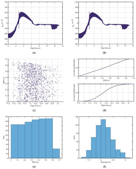 The Monte Carlo simulation results: (a) Missile accelerations along axis; (b) Missile accelerations along axis; (c) The flight time and ZEM of the 1000-run simulation; (d) The cumulative distribution function of ZEM and flight time; (e) The ZEM distribution in the 1000 runs; and (f) The Flight time distribution in the 1000 runs.