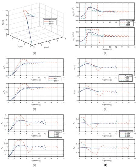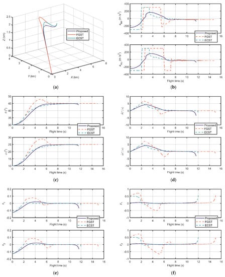 The other initial parameters of these two scenarios are the same as those in Section 4.1. Figure 6 and Figure 7 demonstrate the comparison results of case 1 and case 2, respectively. Figure 6a and Figure 7a show the relative distance trajectories between missile and target. It can be clearly seen that the trajectories of the three guidance laws can all converge to zero. Moreover, the curves of the proposed are shorter than others. Figure 6b and Figure 7b depict the acceleration commands. It can be noticed that the acceleration commands of FGST and ECST reach the ultimate maximum lateral acceleration during the flight time. Moreover the command curves of FGST have distinct chattering. Contrarily, the curve of the proposed has smaller maximum values and smooth properties. The LOS angles are illustrated in Figure 6c and Figure 7c, and the LOS angular rates are illustrated in Figure 6d and Figure 7d, respectively. The LOS angles of the proposed reach the desired angles faster than the others. Moreover, its angular rates have smaller sizes in the vicinity of zero. The sliding variables of the two cases are shown in Figure 6e and Figure 7e, respectively, which all converge to zero in finite time. Figure 6f and Figure 7f show the convergence of super-twisting state variable . It is obvious that the range values to which the proposed guidance law converges are much smaller than the others in these cases.