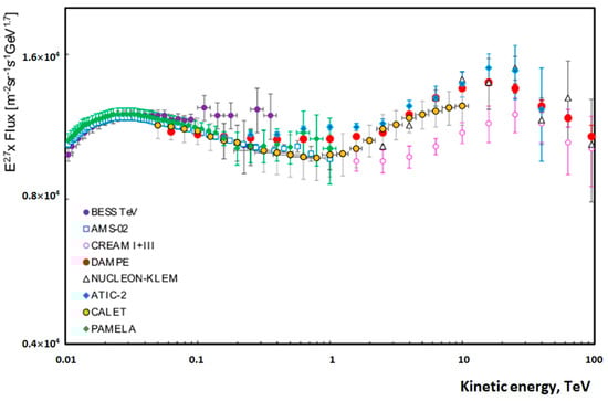 - Adriani, O.; Akaike, Y.; Asano, K.; Asaoka, Y.; Bagliesi, M.G.; Berti, E.; Bigongiari, G.; Binns, W.R.; Bonechi, S.; Bongi, M.; et al. Direct Measurement of the Cosmic-Ray Proton Spectrum from 50 GeV to 10 TeV with the Calorimetric Electron Telescope on the International Space Station. Phys. Rev. Lett. 2019, 122, 181102. [Google Scholar] [CrossRef]