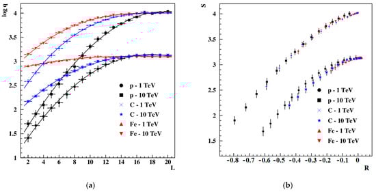 The mean cascade curves for these cascades are presented in Figure 3a. Error bars show statistical errors. As can be seen in Figure 3a, the development of the proton and Fe cascades is significantly different. At L < 8 Fe showers with energy of 1 TeV have log q higher than proton showers with energy of 10 TeV. The most significant factors determining the observed differences are the penetration depth before the first interaction and the number of secondary particles formed.