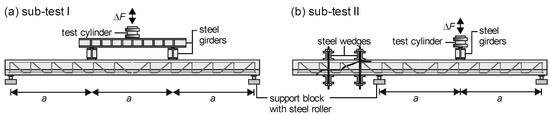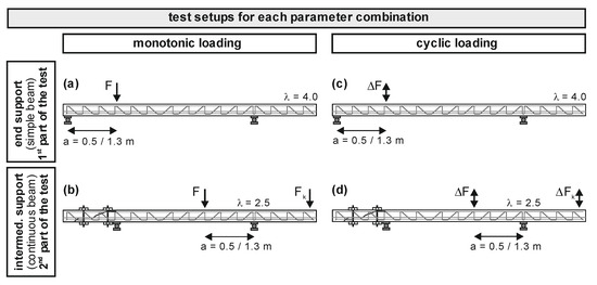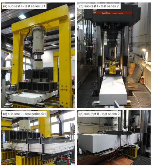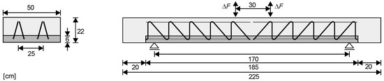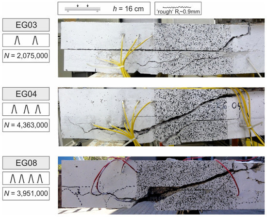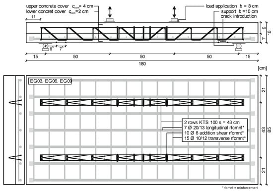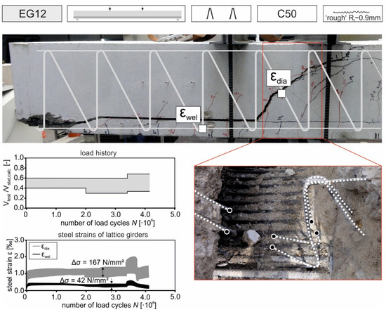 All fatigue tests were conducted under cyclic loading with a frequency of f = 2.0–2.5 Hz and a constant load range up to N = 2.0 million load cycles. The upper load limit for the cyclic loading was determined to generate a tensile stress in the diagonals of 70% of the yield strength, which results in a load exceeding the approved frequent load by 25%. The applied stress range in the diagonals varied between ΔσDia = 180–230 N/mm2. After reaching the N = 2.0 million load cycles, the specimens were loaded monotonically until failure. Comprehensively for all test series, the shear span to effective depth ratio was kept between a/d = 3.4–3.8, and the concrete compressive strength varied between fcm,cyl = 16.1–39.3 N/mm2 for the precast slab and fcm,cyl = 13.9–32.5 N/mm2 for the in situ concrete. The lattice girders in the slab’s cross section were placed in one, two, or three rows to determine the effect of the amount of interface reinforcement. The interface quality was left as cast, with an additional bond breaker or intentionally roughened by raking (according to [29]). Figure 3 shows an exemplary test specimen from the test series conducted for lattice girder KTS [50].