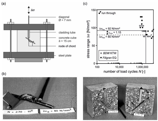 Due to absence of fatigue–strength curves (SN curves, Figure 5a) for lattice girders, the fatigue design of semi-precast slabs with lattice girders was limited to a simplified verification by limiting the stress range in the diagonals to ΔσRsk = 92 N/mm2 for N = 2.0 million load cycles. In order to extend the range of application by deriving SN curves for lattice girders, small-size fatigue tests with lattice girder diagonals cast in concrete cubes have been conducted at the Institute of Structural Concrete (IMB), RWTH Aachen [43,56], using the procedure of the interactive method [57,58] (Figure 5b). This procedure had also been adapted to derive SN curves for other lattice girder systems, e.g., in [36].