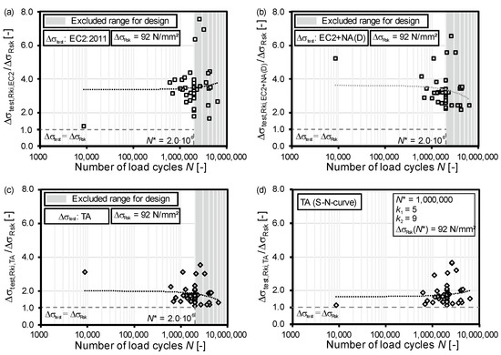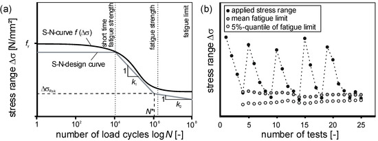 For applying the SN curves in design practice, the overall evaluation was used in order to derive consistent design SN curves (Figure 5a) based on the design format of [28,29], where the trilinear design curves are defined by Equation (4).