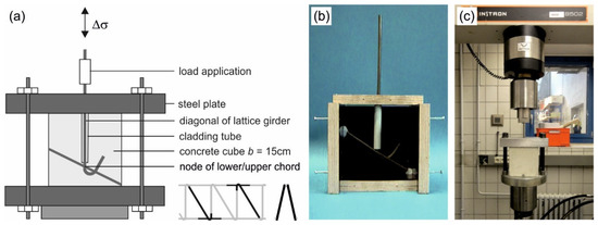 To evaluate the fatigue strength of the welded nodes, the sections between the diagonal and lower chord as well as between the diagonal and upper chord have been investigated. Whereas two diagonals are welded to the upper chord, only one diagonal is welded to the lower chord (Figure 2). For the test specimens, the critical areas were cut out of the girder and casted in a formwork cube with dimension of b = 15 cm and a concrete class of C20/25 (Figure 6a,b). To ensure a direct load application at the critical node, a cladding tube was used to break bond between concrete and reinforcing bar, as described in Section 2.2 for experiments from literature. The top and bottom chords have a diameter of Øchord = 5 mm and were cast up to the edges of the cube to prevent restraints at the ends of the chords. The diagonal (dia) bar had a length of 300 mm and a diameter of Ødia = 7 mm, which satisfies the required test length of 140 mm or 14·Ø = 98 mm according to [59].