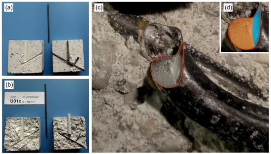 For the fatigue tests, the concrete cubes were clamped between two steel plates, and the cyclic loading from the test cylinder was introduced by wedge anchorage to the diagonal bar (Figure 6a,c). The load was applied with a frequency of f = 20 Hz up to N = 5.0 million load cycles.
