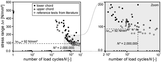 The test results of the static and fatigue tests of lower and upper chords are shown in Figure 8. For comparison, the test results from fatigue tests from literature [40,52] (Section 2.2) were added to the diagram. The comparison of the applied stress range Δσ and reached number of load cycles N for the lower chords (black points) and upper chords (grey points) shows a similar distribution of test results. For most cases, the upper chord tests bore fewer load cycles for high stress ranges but with less scatter compared to the lower chords. The required stress range according to the technical approval of the lattice girders with ΔσRsk = 92 N/mm2 for N = 2.0 million load cycles was satisfied for all tests.