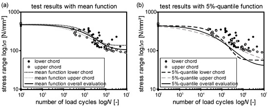 The analysis confirms that tests with lower chords (black points and black dotted curve) resisted a higher number of load cycles compared to tests with upper chords (grey points and grey dotted curve), but with higher scatter. This influences the 5% quantile function, especially in the range of fatigue strength. The 5% quantile curve of the overall evaluation (black curve) only exceeds the curves of the individual evaluation in the range of short time fatigue strength for the upper chords and in the range of fatigue strength for the lower chords. However, the stress ranges of all test data are located above the overall evaluation.