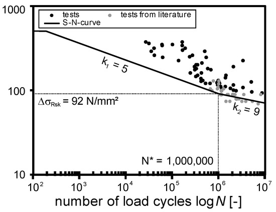 The comparison of the test results from literature shows the extended range of the fatigue–strength relation, especially for high stress ranges and low number of load cycles. In most cases, the own investigations resisted a higher number of load cycles within the range of small stress amplitudes, which can be explained by improved welding processes, since the tests from the literature date back more than 25 years.
