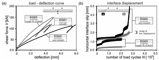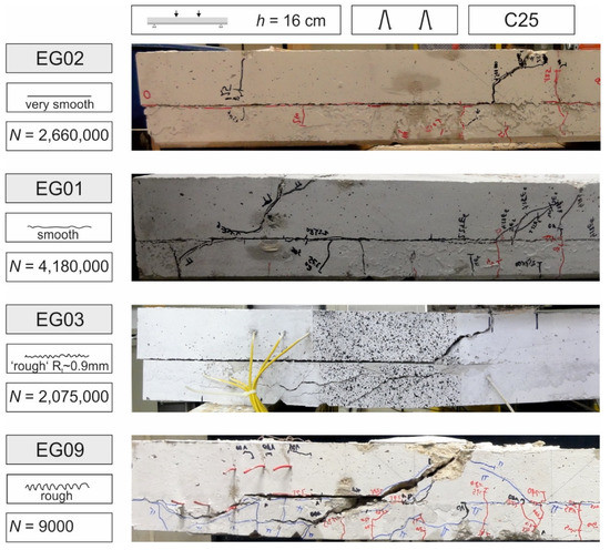 Most tests were stopped before fatigue failure after reaching the reference number of load cycles, and a static test was conducted to assess residual strength. Another group of tests showed fatigue bending failure. Interface shear failure only occurred for four specimens during cyclic loading and for two specimens during static testing of residual strength. These specimens had a smooth surface including a bond breaker. Vertical shear failure did not occur at all.