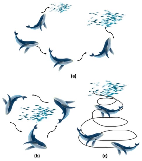 Mirjalili and Lewis proposed the whale optimization algorithm based on abstract modeling of the hunting strategies of humpback whales; it mimics the bubble-net feeding in the foraging behavior of humpback whales [28]. Humpback whales hunt close to the surface while trapping the prey in a net of bubbles. They create this net when swimming on a ‘6′-shaped path. The algorithm mimics two phases: the first phase (exploitation phase) is to encircle the prey and attack with spiral bubble nets, and the second phase (exploration phase) is searching randomly for prey. Figure 2 shows a series of behaviors of humpback whales as they hunt prey. Figure 2a shows the movement of the whale toward the prey, during which the whale can choose to move toward the lead whale or in a random direction. Figure 2b illustrates the shrinking encircling mechanism used by whales to capture prey. Besides the shrinking encircling mechanism, the whale also moves further toward the prey in a spiral shape, during which the whale emits a bubble attack to surround the prey, as shown in Figure 2c. The details of each phase are presented in the following subsections.