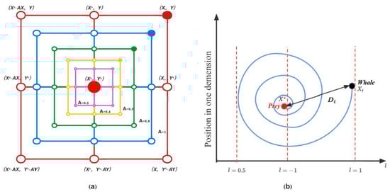 Bubble-net search mechanism implemented in WOA. ( represents the best solution obtained so far): (a) shrinking encircling mechanism; (b) spiral updating position.